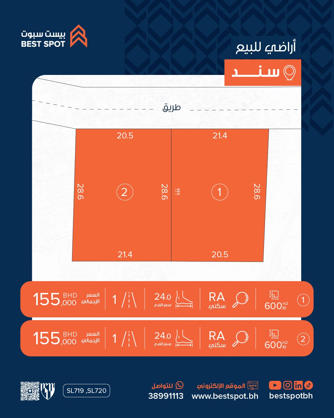للبيع أرضين متلاصقتين نفس المواصفات في منطقة سند